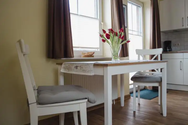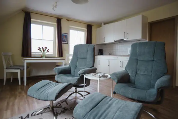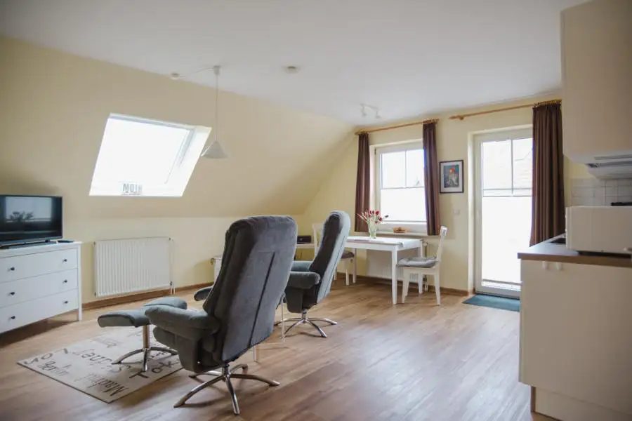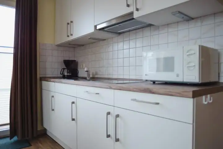 - Küchenzeile mit 4-Plattenherd , Microwelle, Abzug, Kühlschrank, Kaffeemaschine, Wasserkocher, Toaster, Eierkocher und ausreichend Geschirr für den täglichen Bedarf.