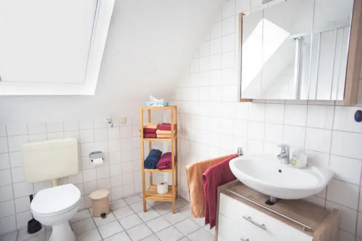- In dem hellen Bad finden Sie eine geräumige Duschkabine, ein WC, Waschbecken und einen Spiegelschrank.